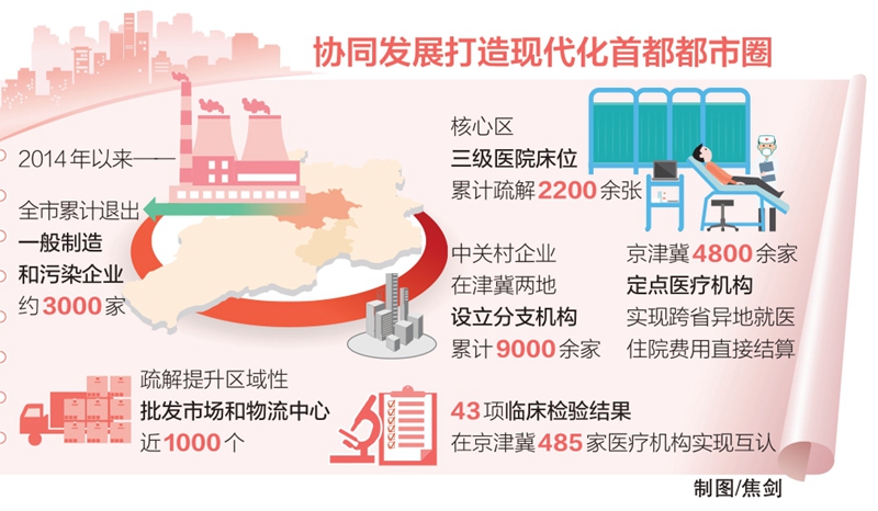 北京市京津冀协同办负责人说,过去5年,北京坚定有序疏解非首都功能,充分发挥“一核”的辐射带动作用,推动雄安新区和城市副中心“两翼”联动发展,重点领域任务取得新进展,现代化首都都市圈生机勃勃。