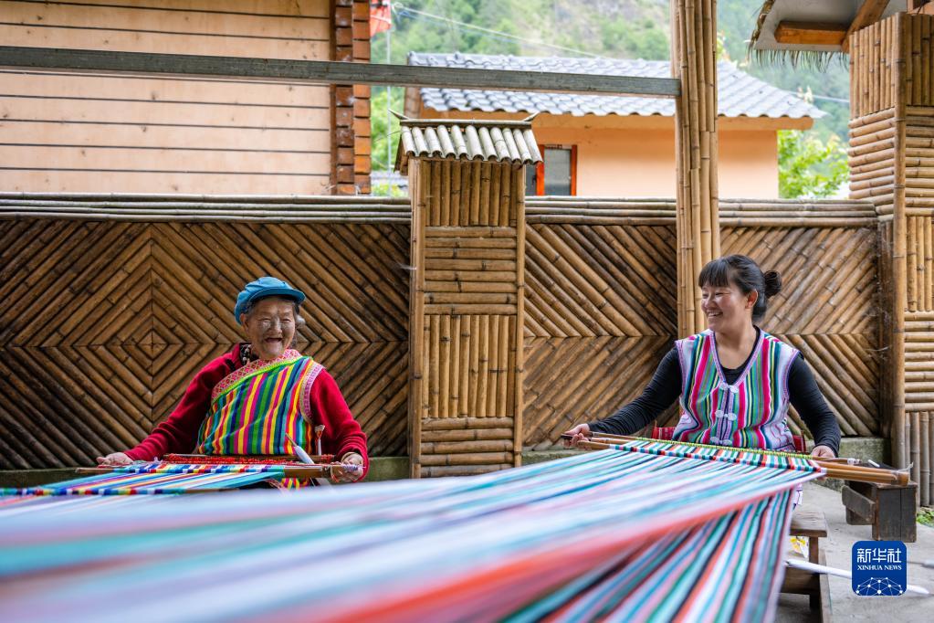 在云南省贡山独龙族怒族自治县独龙江乡迪政当村,独龙族老人李文仕(左)和女儿在编织独龙毯(5月10日摄)。新华社记者曹梦瑶 摄