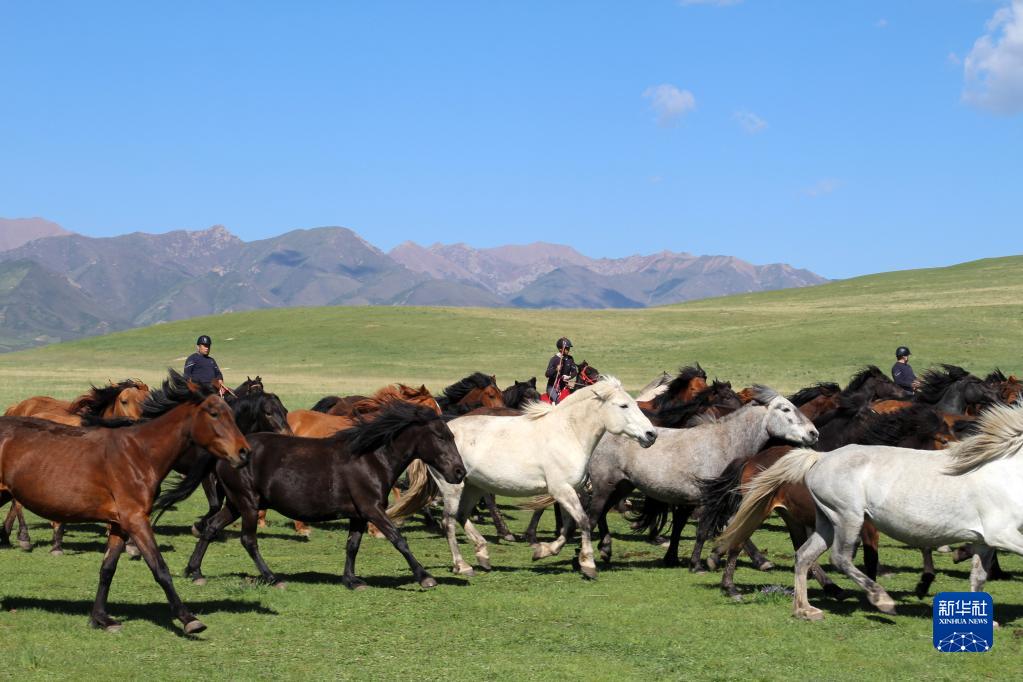 山丹马场一场的牧马人在放马,如今的山丹马场正努力打造国家优质马种质资源保护及速力型赛马培育基地(6月10日摄)。新华社记者张智敏 摄