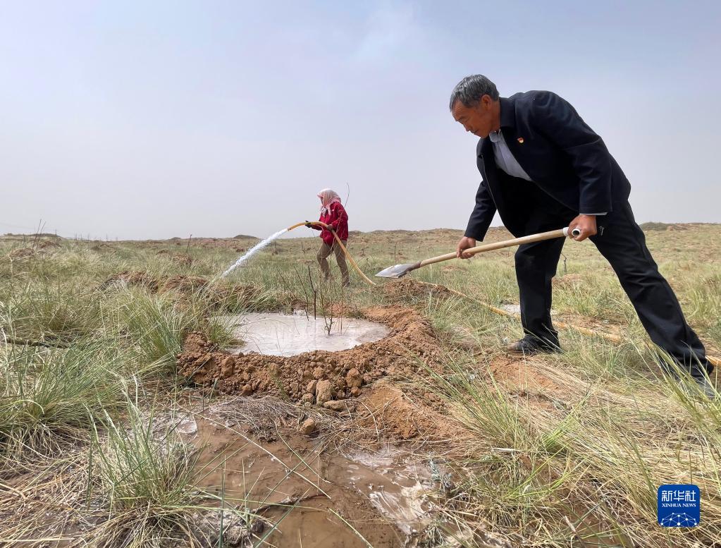 甘肃省武威市古浪县八步沙林场场长郭万刚(右)与林场职工为新种树苗浇水(5月6日摄)。新华社记者郭刚 摄