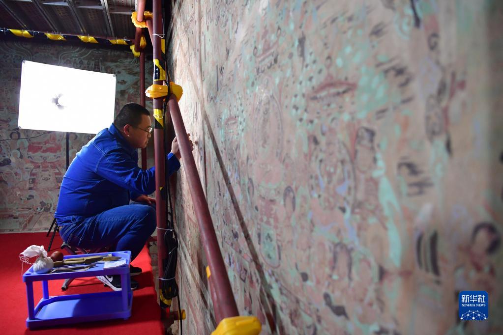 敦煌研究院文物保护技术服务中心壁画修复师杨金礼在莫高窟第231窟内修复出现病害的壁画(4月19日摄)。新华社记者陈斌 摄