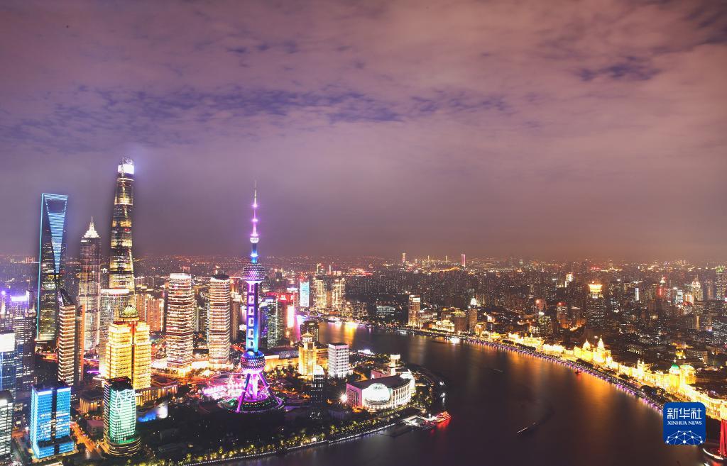 从上海白玉兰广场顶楼俯瞰浦东陆家嘴夜色(2020年10月18日摄,多重曝光图)。新华社记者方喆 摄