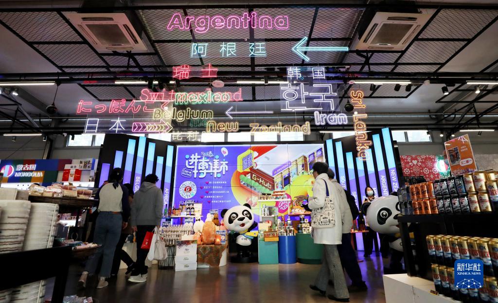 在上海市南京路上的进博集市内,顾客们走在一处各国商品集中展示台前(2021年11月8日摄)。新华社记者方喆 摄