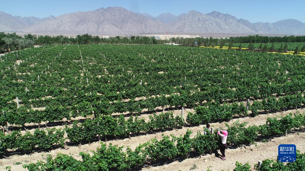 这是位于贺兰山下的宁夏银川市沃尔丰酒庄葡萄种植基地(无人机照片,6月14日摄)。新华社记者王鹏 摄