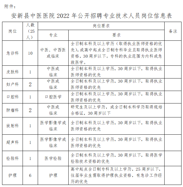 附件:安新县中医医院2022年公开招聘专业技术人员岗位信息表