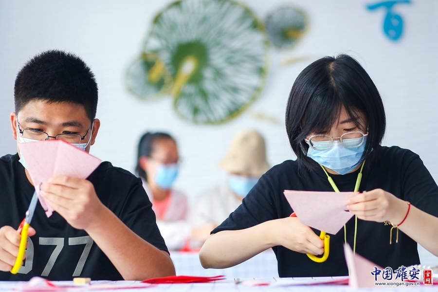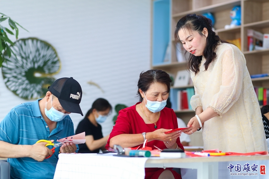 6月29日,剪纸老师正在为容东回迁群众讲解剪纸技巧。杨亚文 摄