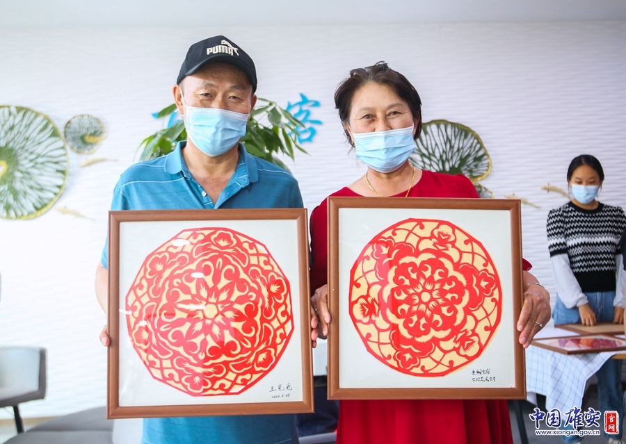 回迁群众与其剪纸作品合影。杨亚文 摄