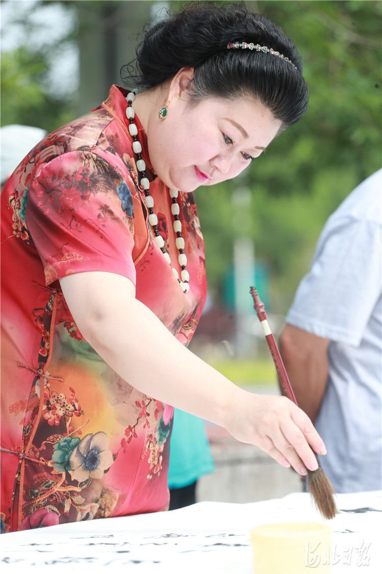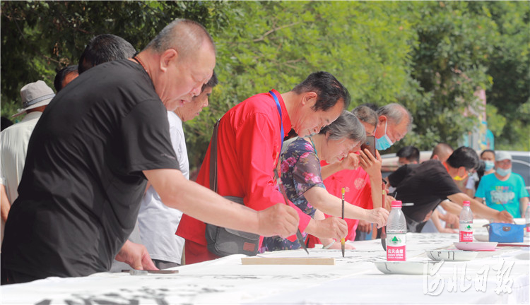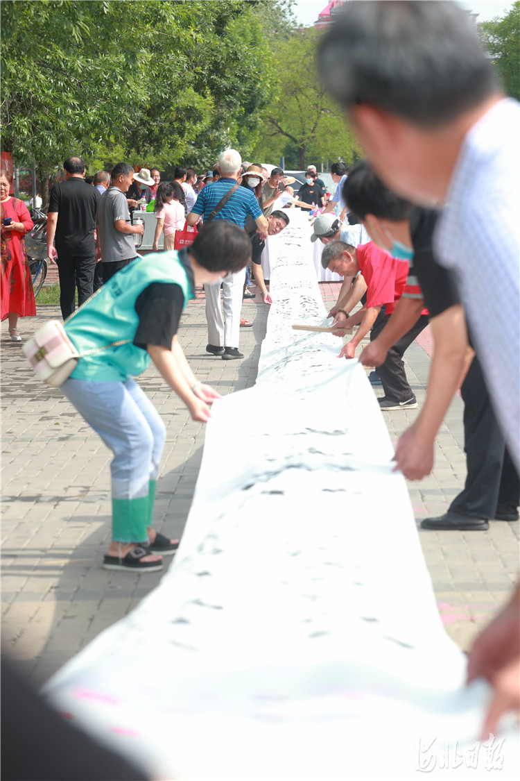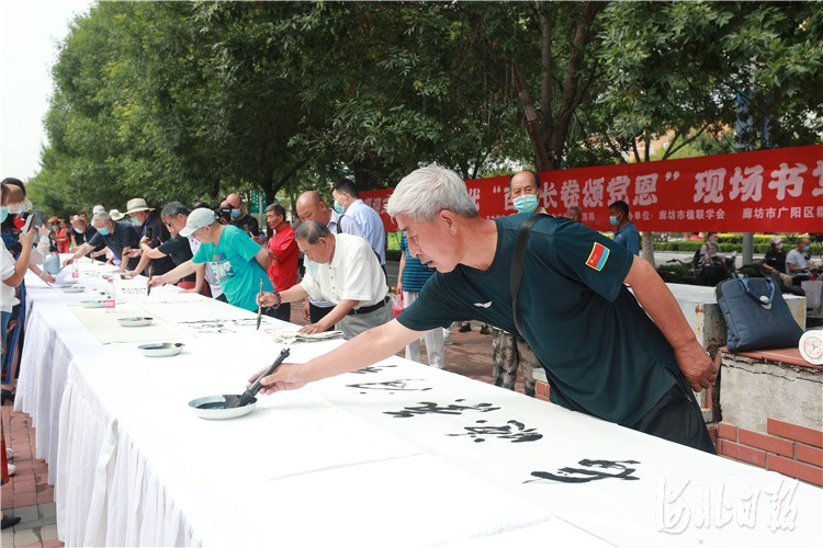 6月30日上午,由廊坊市广阳区文化广电和旅游局主办,廊坊市楹联学会、广阳区群众艺术馆等承办的“百米长卷颂党恩”现场书写活动在廊坊市人民公园西门举行。廊坊市100余位书法楹联爱好者齐聚一堂,挥毫泼墨共同创作百米书法长卷。书法楹联爱好者热情高涨,现场书写歌颂党、歌颂祖国的自撰联、诗句、口号等,抒发对党无限热爱之情。