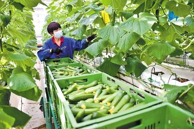 日前,河北邢台市南和区贾宋镇一家现代智慧农业园区的工人在采摘黄瓜。新华社记者朱旭东 摄