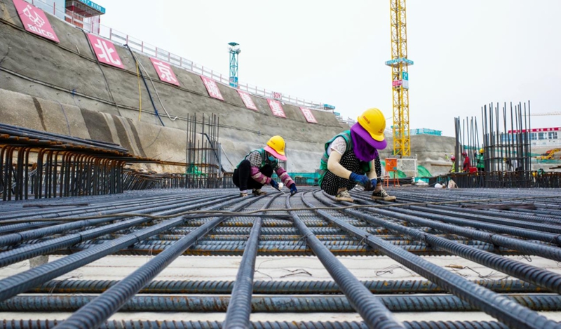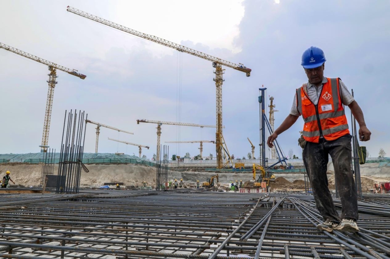 2022年7月5日,在雄安体育中心项目体育场施工现场,工人们正在加紧施工。河北日报记者李东宇 摄