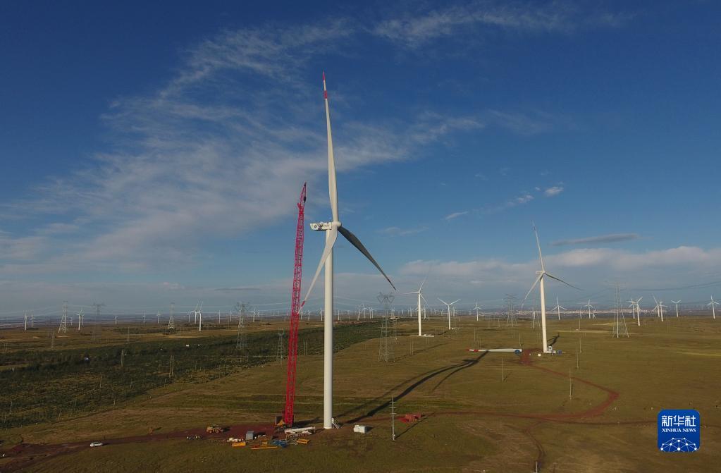 在河北张家口市张北县大河乡,工人在一处风电场安装风力发电机(2020年9月15日摄,无人机照片)。新华社记者杨世尧 摄
