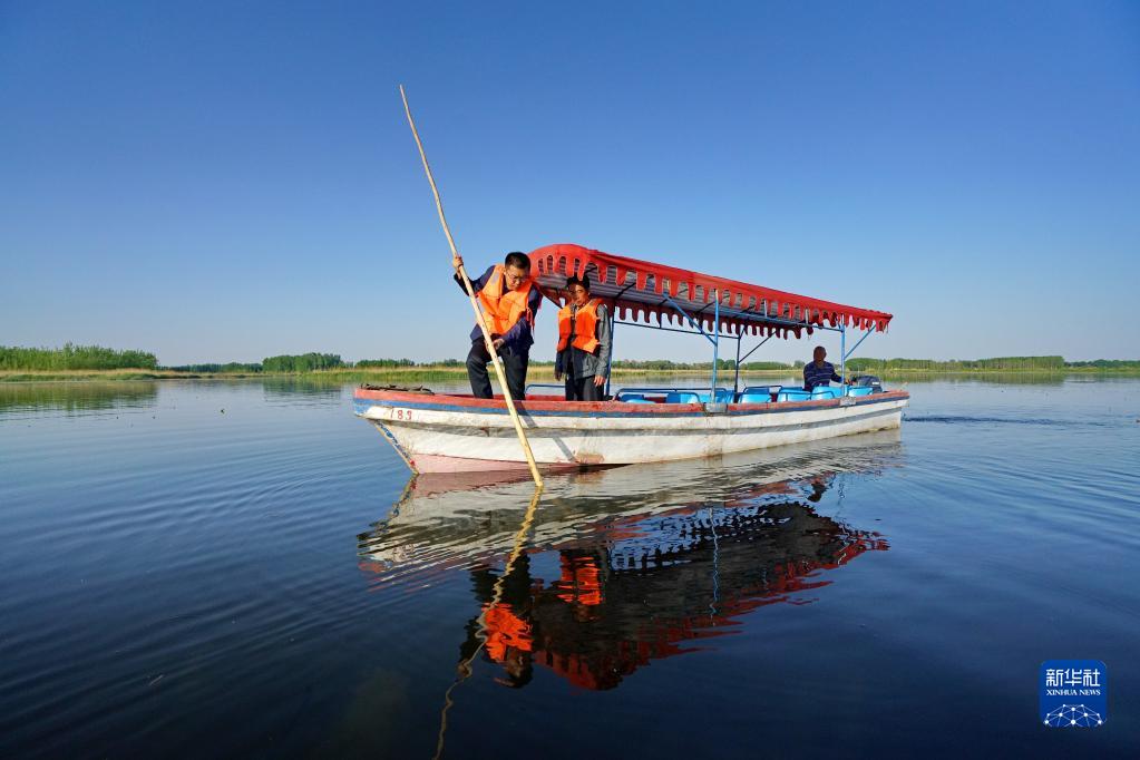工作人员在白洋淀测量水位(2019年4月30日摄)。新华社记者牟宇 摄