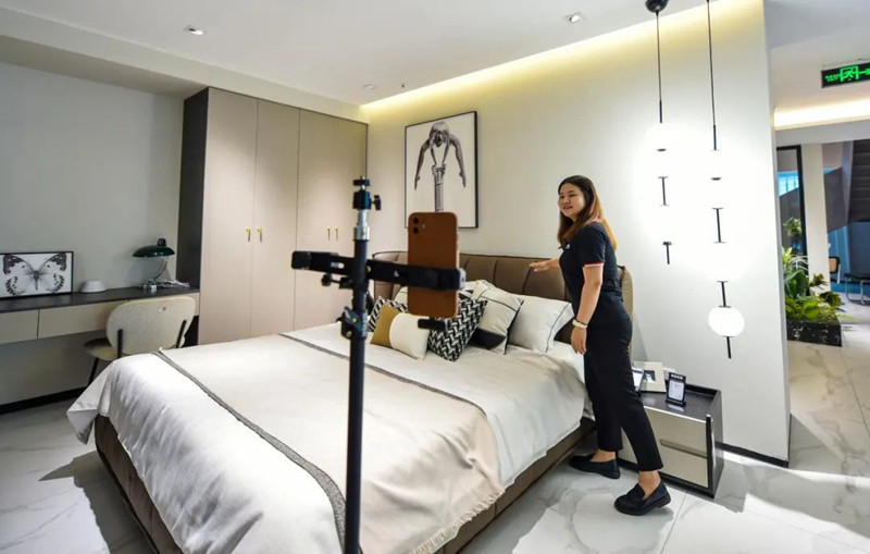朱各庄产业园内的产品展厅中,工作人员通过线上直播的方式推广产品。河北日报记者李东宇 摄