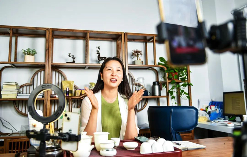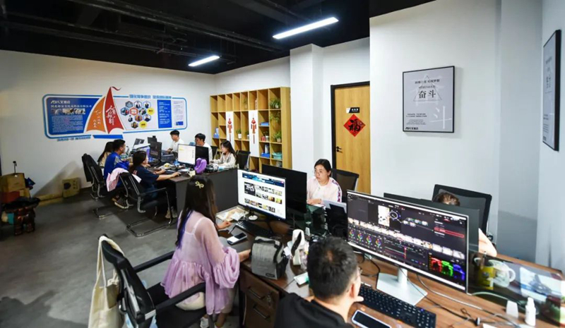 朱各庄产业园内的工作人员在进行线上直播。河北日报记者李东宇 摄