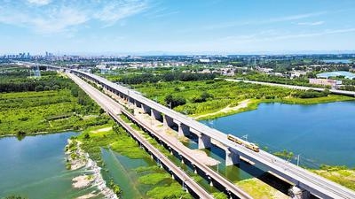 7月14日拍摄的京唐铁路跨三河市潮白河段。作为国家重点工程、京津冀城际轨道交通网络的重要组成部分,京唐铁路正线铺轨已全面完成,为按期开通夯实基础。新建北京至唐山铁路起自北京城市副中心站,终至我省唐山市既有唐山站,途经北京市通州区、廊坊市、天津市宝坻区、唐山市,正线线路全长为147.992公里,全线共设置车站8座。目前,京唐铁路建设正在按照节点要求扎实推进。京唐铁路建成后,北京到唐山的运行时间将大幅减少,对于带动沿线地区经济社会发展,疏解北京非首都功能,提升区域整体经济竞争力,增强区域聚合力,落实京津冀协同发展国家战略具有重要的意义。河北日报记者赵永辉 摄