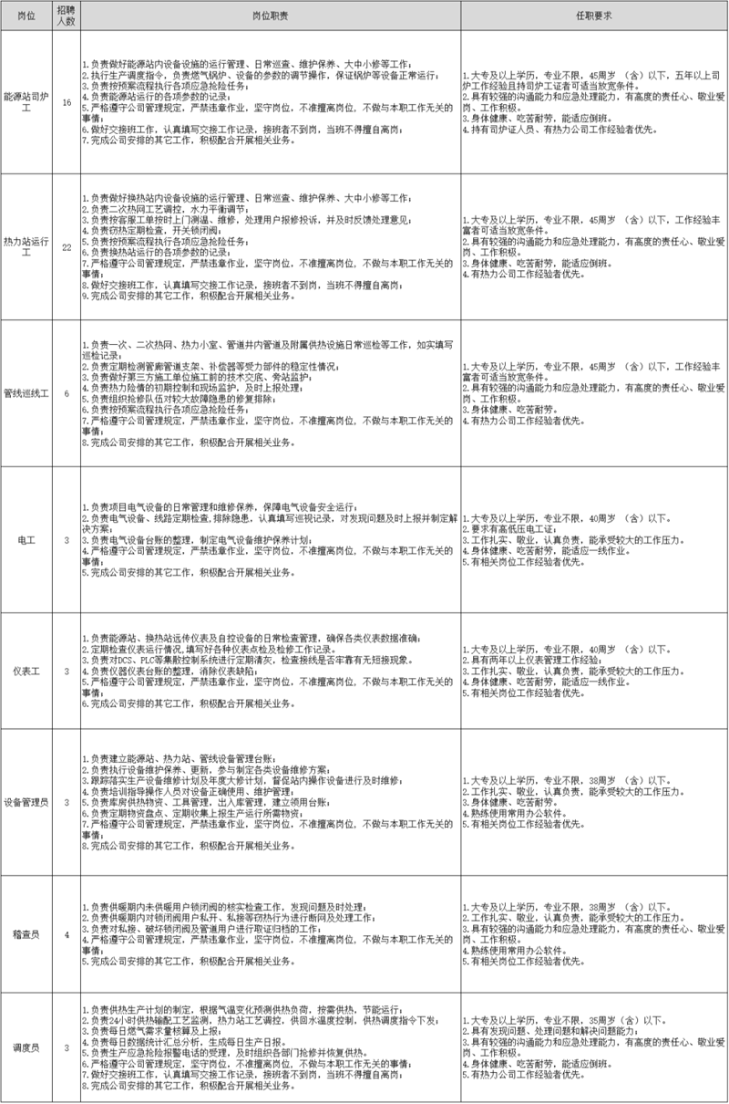 河北雄安人力资源服务有限公司(以下简称雄安人力公司)根据工作需要,现面向社会公开招聘业务外包员工。工作地点在雄安新区,从事能源站司炉工、热力站运行工、管线巡线工、电工、仪表工、设备管理员、稽查员、调度员等相关工作。