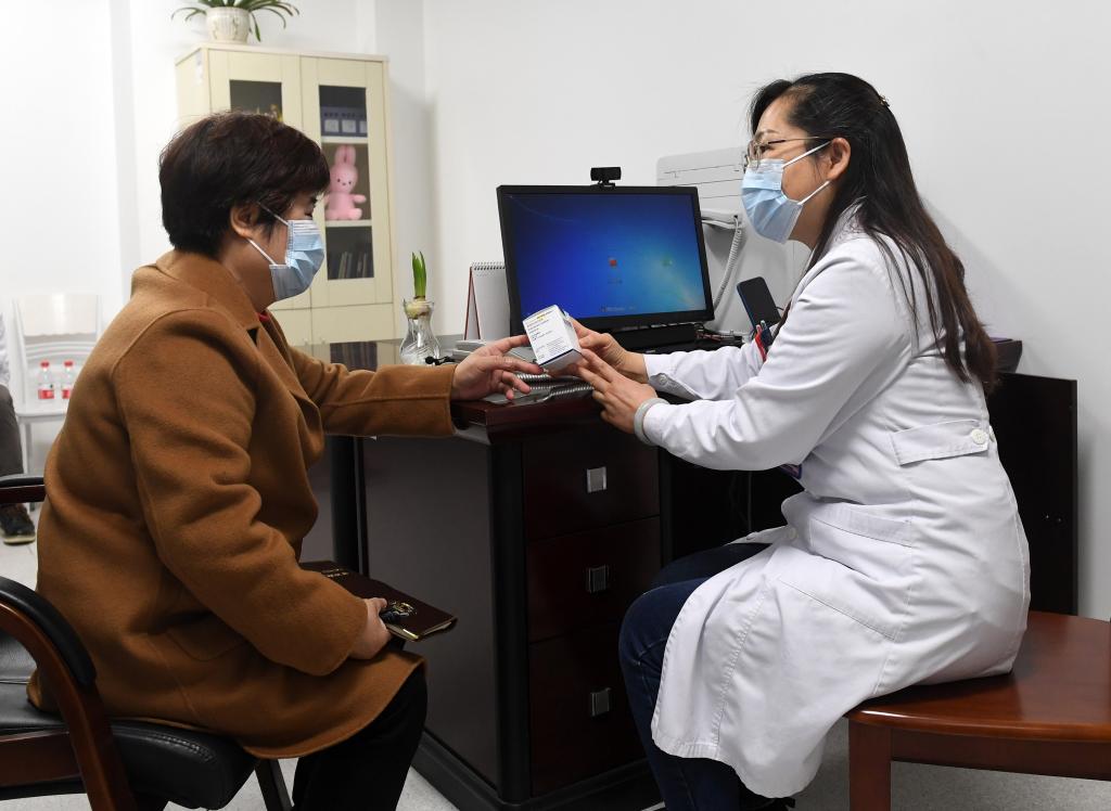 在广西壮族自治区妇幼保健院,全国政协委员杜丽群(左)了解罕见疾病用药及其价格情况(2022年2月16日摄)。新华社记者陆波岸 摄