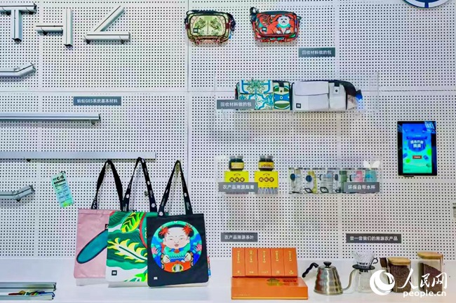 蚂蚁集团的展位还展出了若干款环保包。“这些都是由上一年度成果展上蚂蚁展区的回收材料所制成,这些材料参加了全年各个地方的展会后,在年末进行回收。”蚂蚁集团相关负责人说。