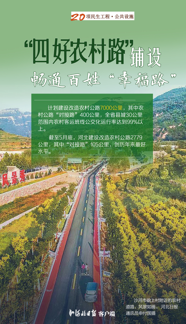 今年,河北继续实施20项民生工程。其中,围绕城乡公共设施,河北坚持把“民生工程”办成“民心工程”,新增公共停车位、规划建设“口袋公园”、建设改造农村公路……让群众幸福感不断提升。
