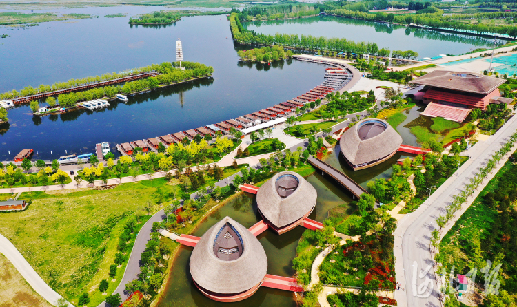 俯瞰雄安新区白洋淀码头。雄安新区设立以来,白洋淀生态环境持续改善,淀区整体水质达到Ⅲ类,步入全国良好湖泊行列。
