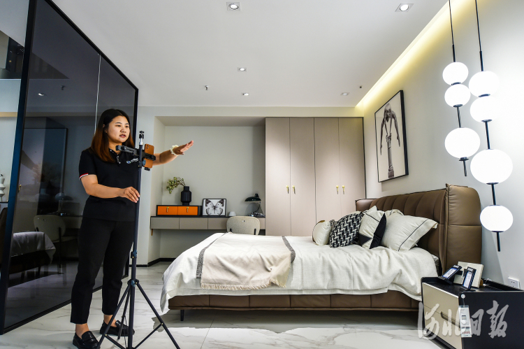 中国(雄安新区)跨境电子商务综合试验区朱各庄产业园内的产品展厅中,工作人员通过线上直播推广产品。