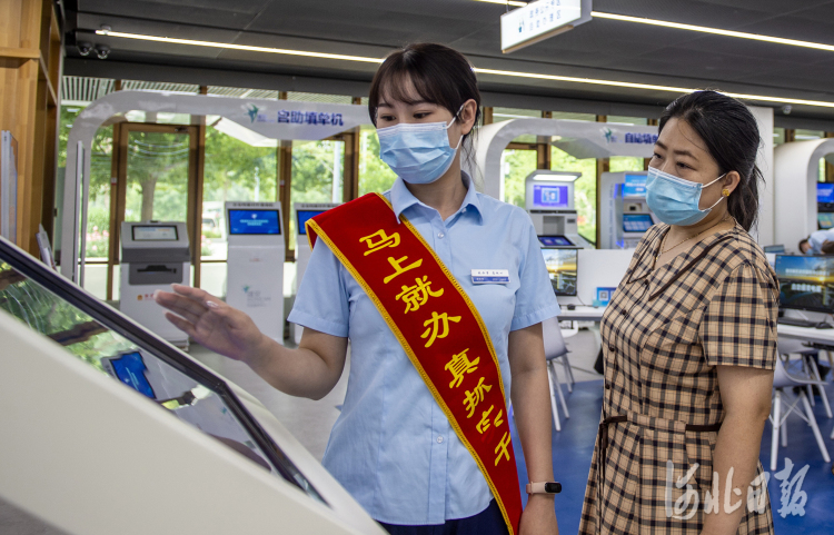 2022年7月27日,在雄安新区政务服务中心大厅内,工作人员在为前来办理业务的市民提供引导服务。