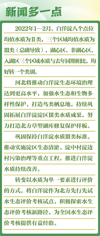 “目前,白洋淀已经从污染治理为主向污染治理与生态恢复并重阶段转化,进而向生态修复为主阶段转变,为承接北京非首都功能疏解创造了良好环境。”雄安新区生态环境局副局长吴海梅介绍,下一步,新区将从单一的水质评价向水生态健康评价转变,为雄安新区生态典范城市建设提供良好基础。