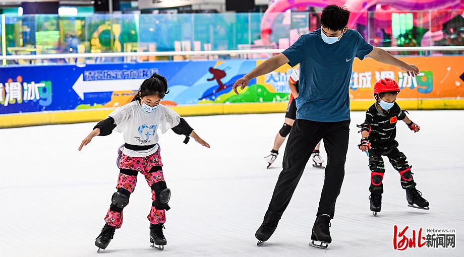 7月14日下午,在石家庄勒泰购物广场5层的勒泰真冰场里,30余名“冰雪小将”穿戴整齐,在教练的带领下鱼贯入场,准备开始当天的冰球和花样滑冰训练课。