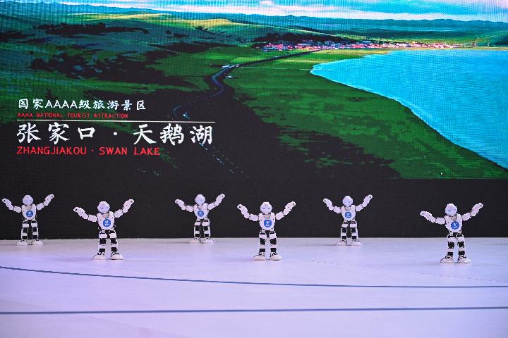 展馆内,各种智能机器人成为“人气王”。一群机器人随着音乐起舞,小朋友们聚精会神地观看,有的还和机器人一起跳起舞来。