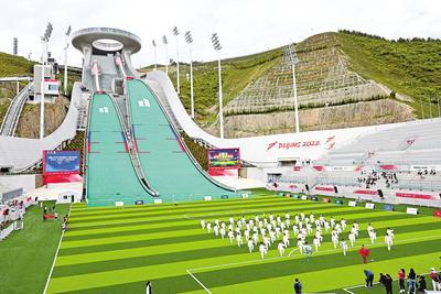 8月8日,健身爱好者在国家跳台滑雪中心“雪如意”进行团体操表演。当日,全国2022年全民健身日主题示范活动暨河北省全民健身日主题活动启动仪式在国家跳台滑雪中心举行。 河北日报通讯员武殿森 摄