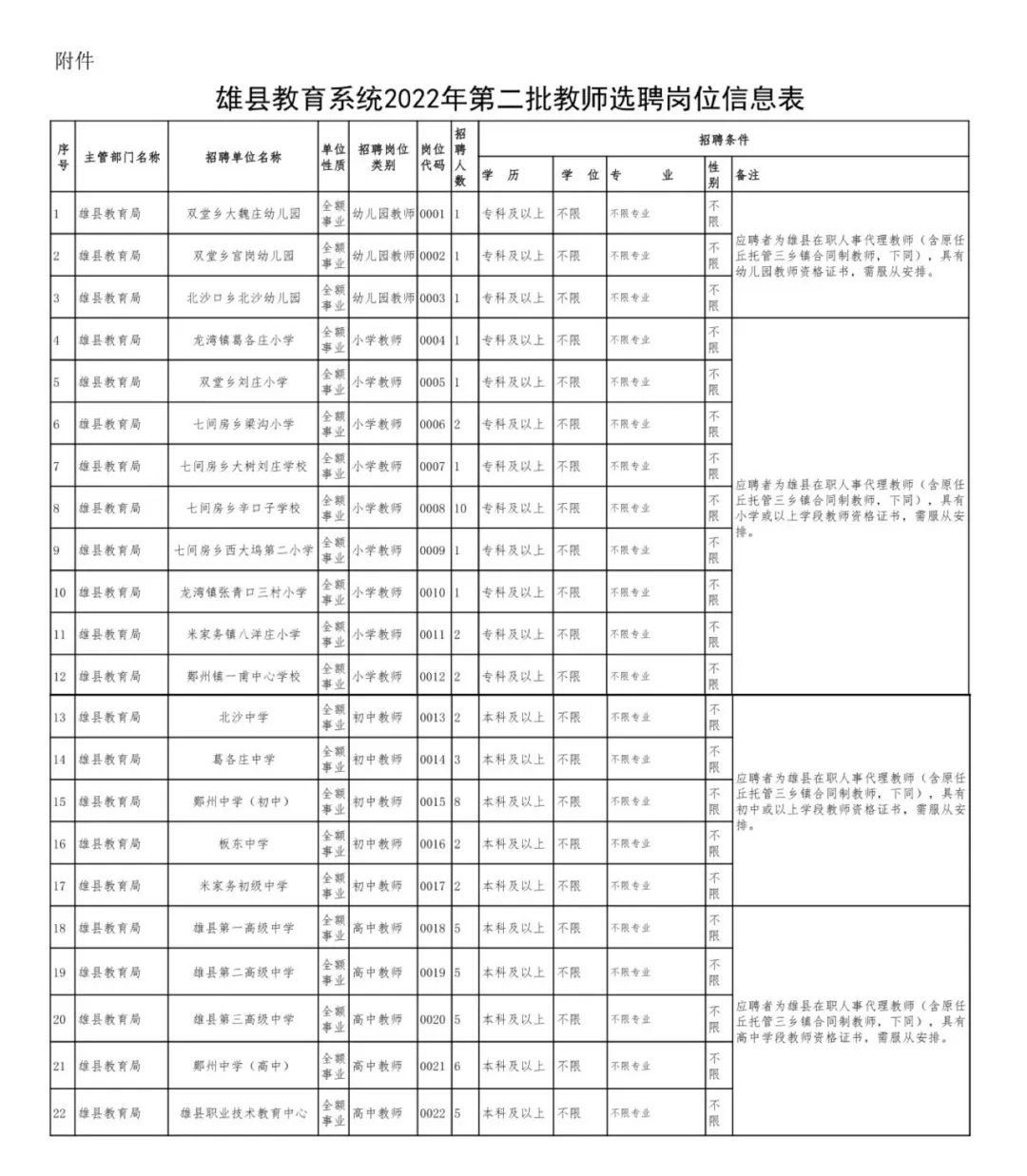 幼儿学段3名、小学学段21名、初中学段17名,高中学段26名,共计67名。详见《雄县教育系统2022年第二批教师选聘岗位信息表》(见附件)