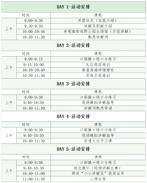 开营仪式、参观郊野公园主场馆、讲解员礼仪规范、讲解技巧、口部操训练、模拟讲解指导、小讲解员成果展示、非遗文化手工课、心得分享。