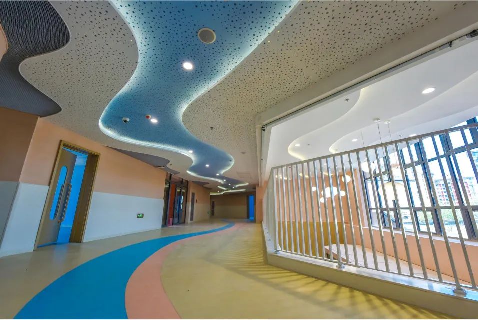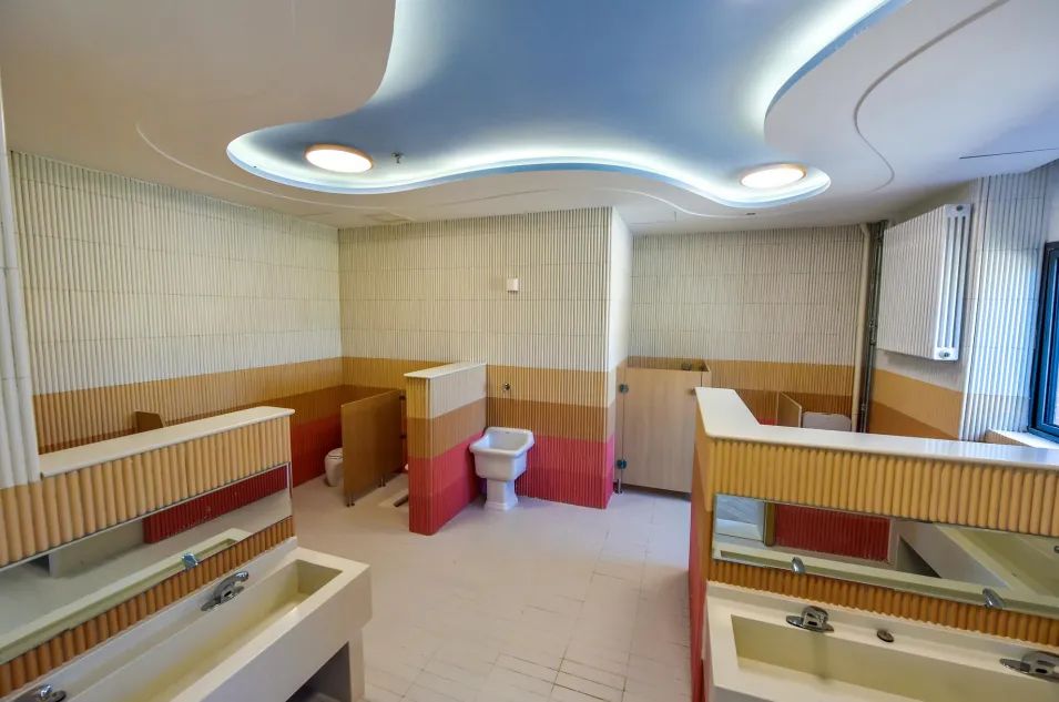 在银帆社区漂亮的幼儿园内,记者看到这里多采用原木色与淡蓝色搭配,色调柔和悦目,园内配有图书室、音乐活动室、美术教室、科学教室等,同时还配建了儿童小马桶、衣帽间等儿童友好设施,以及两扇门之间的人性化的防夹手设计。