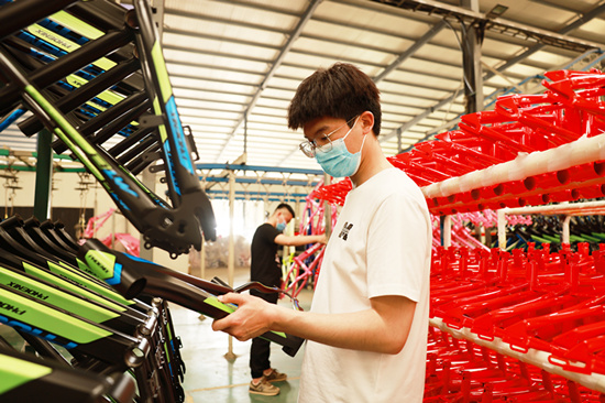 广宗县天王自行车科技有限公司生产车间,员工正在检查自行车车架质量。梁智晓 摄