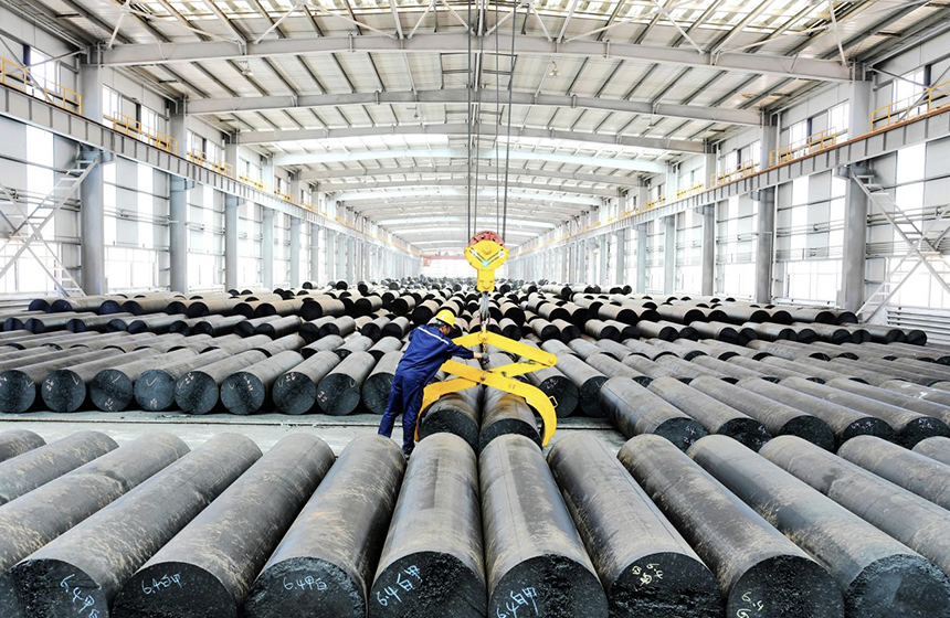 在位于乐亭经济开发区的省重点项目——唐山东日新能源材料有限公司库房,工人正在吊装生产出的超高功率石墨电极产品。刘江涛 摄