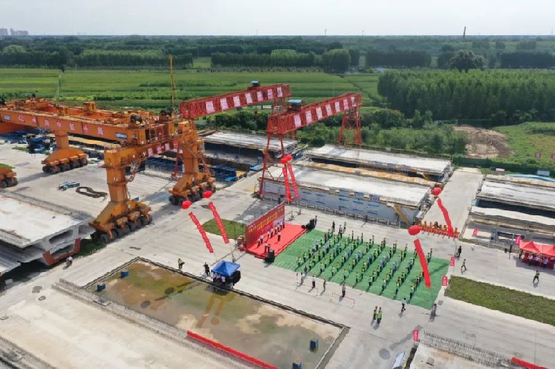 8月20日,雄安新区至北京大兴国际机场快线(R1线)三标段首孔箱梁架设启动仪式在中铁十局永清南制梁场成功举办。三标段架梁工程的启动标志着R1线建设再启新征程。