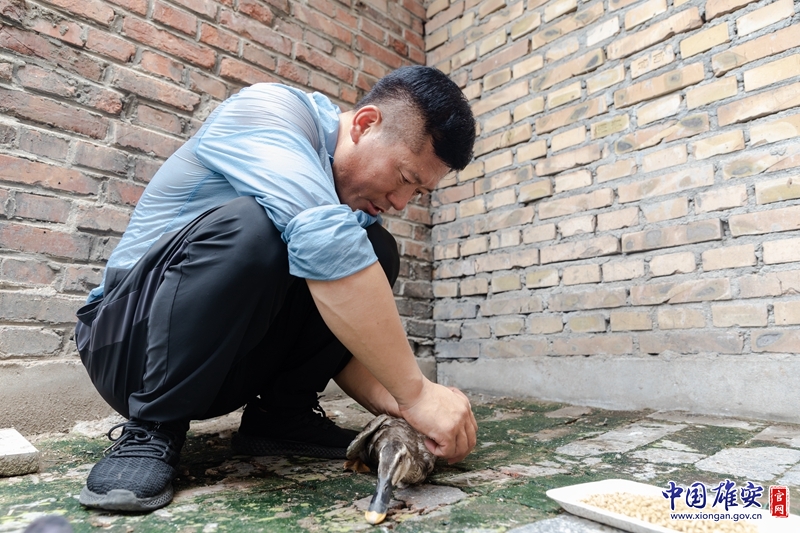 记者到达韩战桥家里时,韩战桥正在喂养野鸭。他说:“这几只鸭子是之前村民们在孝义河湿地发现的,当时还是几枚蛋,他们看到后赶紧来告诉了我。通过我几天的观察,发现母鸭不孵蛋了,就把它们带回来孵出来养到这么大,再过段时间就可以给它们放回水里去了。”