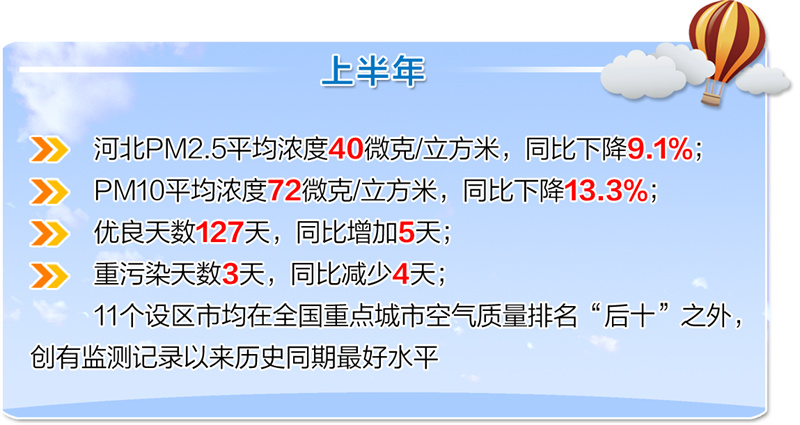 来自省生态环境厅的数据显示,上半年,河北PM2.5平均浓度40微克/立方米,同比下降9.1%;PM10平均浓度72微克/立方米,同比下降13.3%;优良天数127天,同比增加5天;重污染天数3天,同比减少4天;11个设区市均在全国重点城市空气质量排名“后十”之外,创有监测记录以来历史同期最好水平。