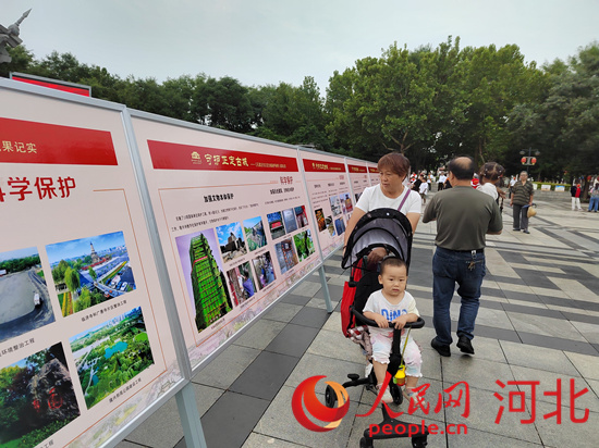正定县居民在子龙广场观看“古城保护成果记实展”。人民网祝龙超 摄