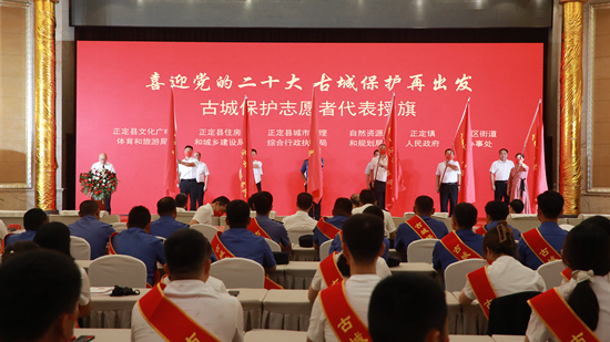 2022年“正定古城保护日”活动现场为古城保护志愿者代表授旗。正定县融媒体中心、正定县委网信办供图