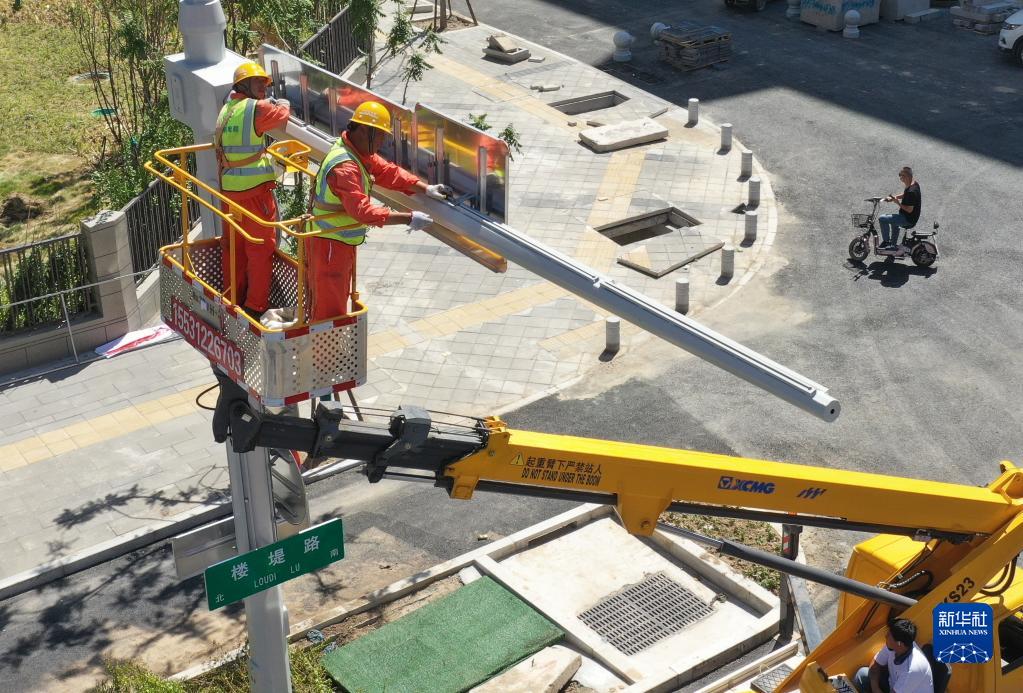 8月25日,工人在雄安新区容西片区进行市政安装施工(无人机照片)。