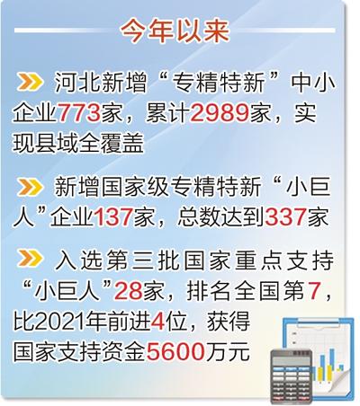 引导中小企业走“专精特新”发展之路,是实现高质量发展的必然要求。省工信厅中小企业处处长刘胜利介绍,今年以来河北新增“专精特新”中小企业773家,累计2989家,实现县域全覆盖;新增国家级专精特新“小巨人”企业137家,总数达到337家;入选第三批国家重点支持“小巨人”28家,排名全国第7,比2021年前进4位,获得国家支持资金5600万元。