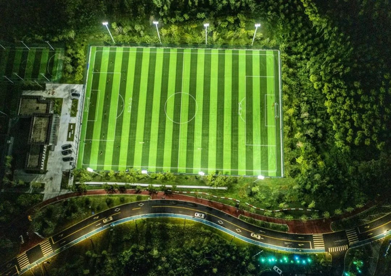 暮色降临,雄安郊野公园张家口体育场内的足球场地灯火通明。河北日报记者李东宇 摄