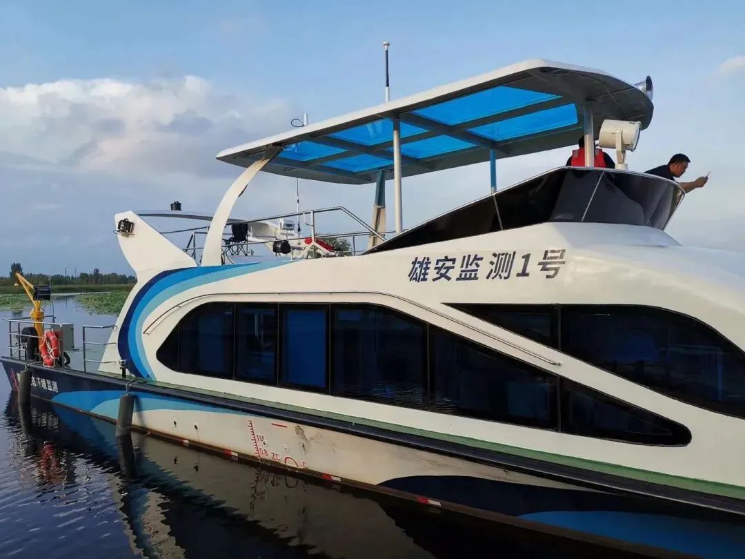 雄安监测一号是全国首个纯锂电池大型水质监测船,配备水上实验室和指挥中心。船长20多米,可以在航行中随时抽水取样进行总磷、总氮、氨氮、COD等13项指标的检测分析。船载5G+VR视频展现监测实景画面,船上检测数据与监控中心数据实时共享,真正实现“不在现场,胜似现场。”