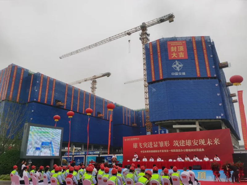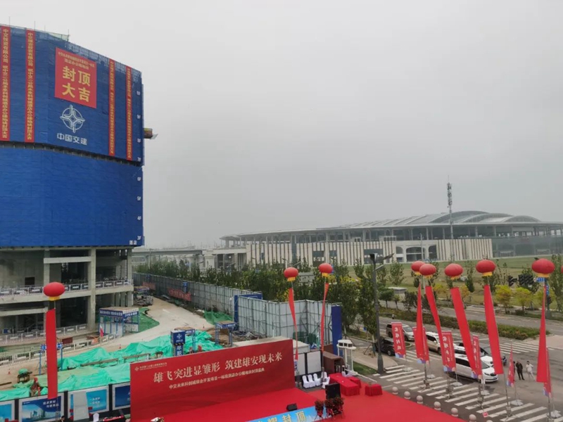 中交未来科创城酒店办公楼地块建筑面积约10万平方米,分为酒店和东西两栋办公楼,地下2层,地上10层,汇集了现代化办公、企业展示、会务接待等多样化功能,为雄安新区承办高规格、高标准会展和商务接待等活动提供了有力支撑。酒店办公楼地块在继4月29日全面冲出正负零后,历时4个月紧张施工,整个地块全面顺利封顶,为公司在雄安新区树立了良好的口碑和企业形象。