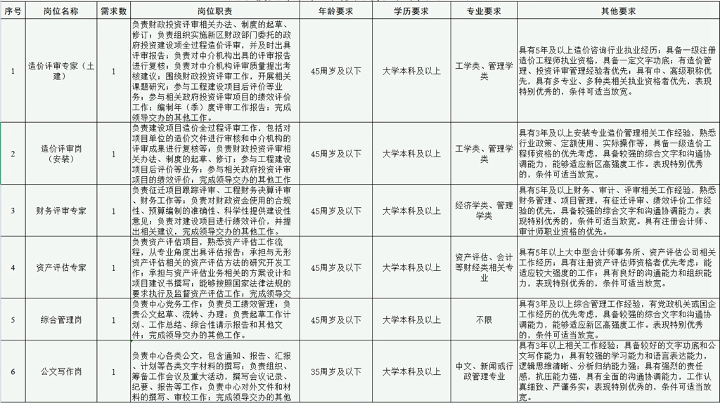 河北京雄政务服务外包有限公司根据工作需要,现面向社会公开招聘6名业务外包员工,派驻至雄安新区有关部门工作,工作地点在雄安新区,从事综合文字、财务审核、造价审核、固定资产评估等相关工作。