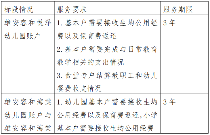 比选内容:拟采购雄安容和教育总校下属学校银行账户开立代理银行,分为4个标段,具体情况如下: