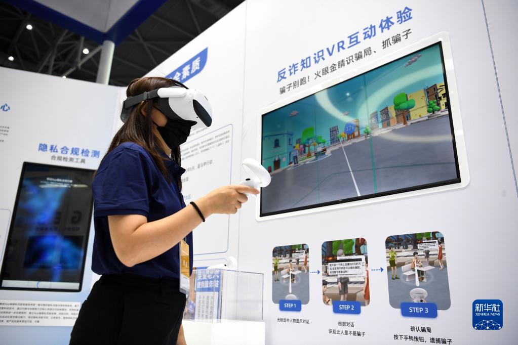 9月4日,一家参展企业代表在演示反诈知识VR互动体验项目。