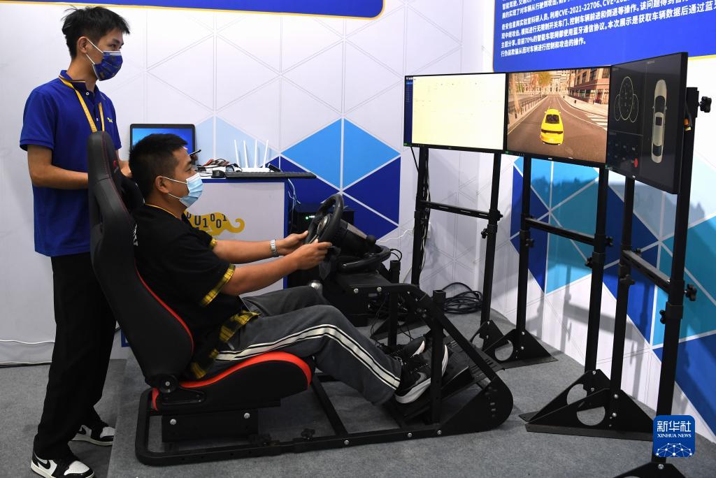 9月4日,一家参展企业代表在演示使用车载网络安全科技产品。