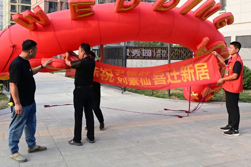 搬家之前,梁神堂工作营的工作队员就提前来到回迁群众尹锁群所租房屋,帮助他们收拾东西、拍全家福留念,并到安置区布置仪式场景。每一个细节工作组都会与村干部、征迁办协调员、昝岗管委会和社区书记共同商议反复推敲,确保完美呈现这具有历史意义的一刻,给群众营造满满的仪式感。